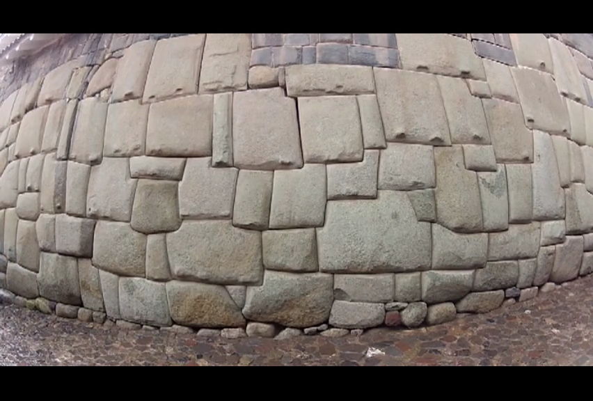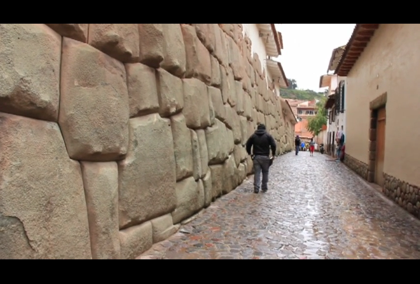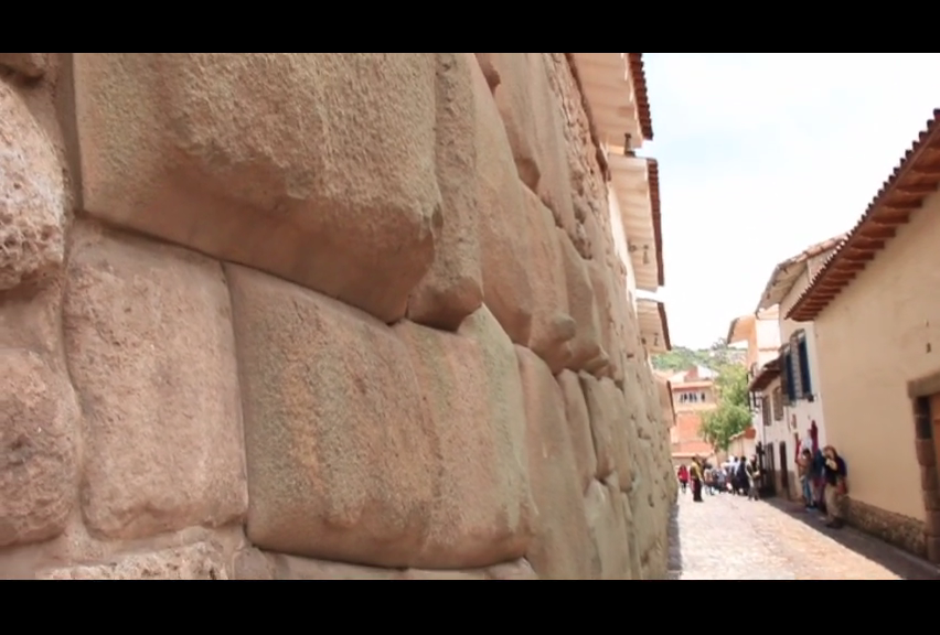 De baixo para cima temos: 1) pedras megalíticas na base; 2) tentativa de reparação Inca; 3) reparação feita pelos espanhóis e; 4) muro e telhado coloniais espanhóis. Praticamente toda a história de Cusco nessa parede.