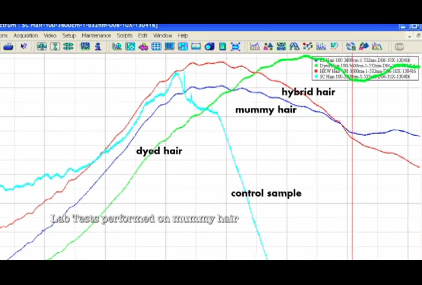 Abaixo temos o exame de espectroscopia mostrando a composição química do cabelo da múmia comparado a outros: