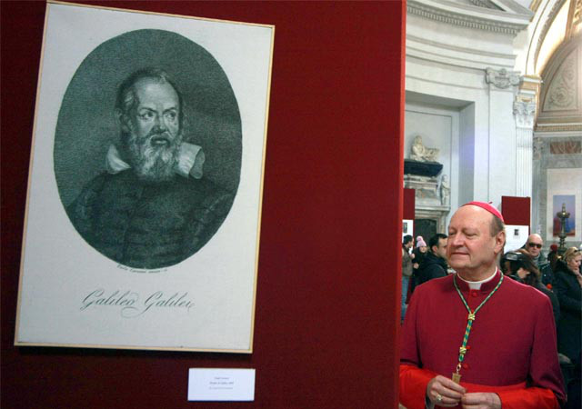 Foto de 15 de Fevereiro de 2009, mostrando o Monsignor Gianfranco Ravasi perto de uma pintura do astrônomo italiano Galileo Galilei. Quatrocentos anos depois de ter acusado Galileo por desafiar a visão de que a Terra não era o centro do universo, o Vaticano chama especialistas para estudar a possibilidade de vida extraterrestre alienígena.