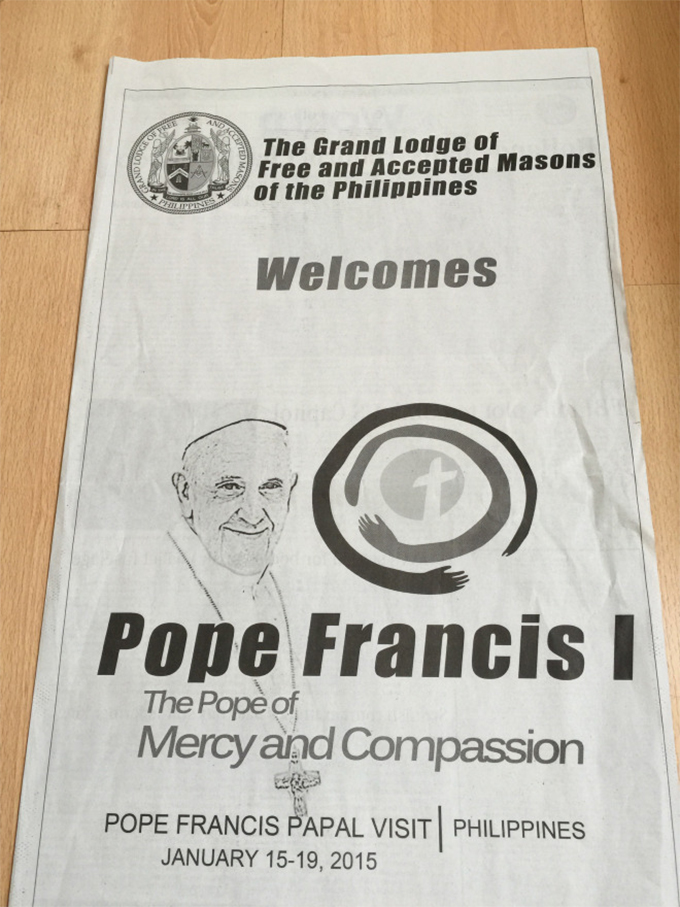 Durante a viagem de Janeiro do Papa Francisco às Filipinas, dentre os grupos que o recebiam, estava o da Grande Loja de Maçons, os quais trouxeram uma página completa na edição de 16 de Janeiro de 2015 do seu principal jornal do país, o “Philippine Daily Inquirer.”