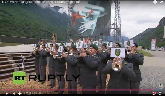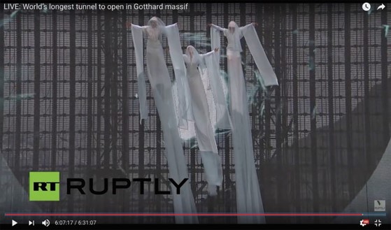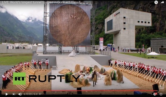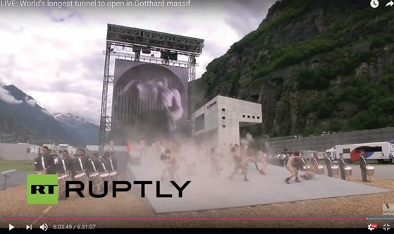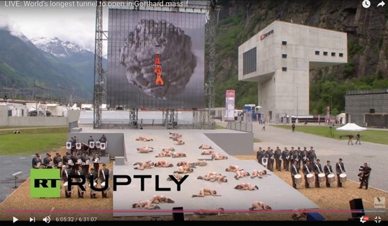 Na última parte, apresentamos os túneis gêmeos do Túnel Base de Gotthard (Gotardo) e a profunda cerimônia ocultista que aconteceu na Suíça, não muito longe do CERN. Na parte de hoje iremos examinar cada parte desse ritual transmitido ao vivo. Ele começa com uma bênção entre as fés como mencionamos antes. Seguindo a invocação da deusa trina, o pastor faz levantar o homem com chifres, que entra pendurado na cena (de forma completa com uma estranha luz vermelha e fumaça, como se estivesse saindo do Abismo), acompanhado por seus amigos infernais, e muitos deles começam a fazer um sexo e poses ritualísticos. Essa parada da promiscuidade também inclui um “anjo” assustador que voa sobre alguns dos mineradores (presumivelmente, representando os nove que morreram). Uma vez que a primeira fase (iremos chama-la de abertura do portal) é concluída, as várias religiões e dignitários políticos entram no trem e vão para o terminal norte em Erstfeld. Notem que a escolha de se começar no sul e terminar no norte representa a ascensão de algo para a superfície, que é a abertura do Abismo.